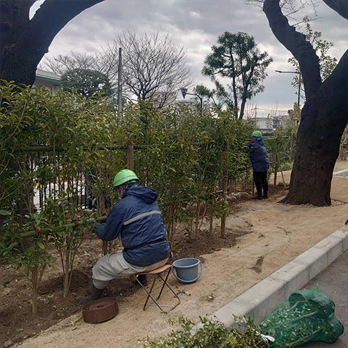公園施設の整備、水道などの設置、樹木の管理、植樹、大木の伐採、またマンションの植木の病害虫の消毒作業など多岐にわたる工事に関らせていただいています。